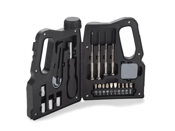 KANNIS to zestaw, w którym znajduje się wiele przydatnych narzędzi: cztery śrubokręty precyzyjne, nożyk do tapet, zwijana miara, uchwyt, cztery klucze nasadkowe z przejściówką i dziewięć bitów. Wszystko razem zamknięte jest w charakterystyczne etui w kształcie kanistra.