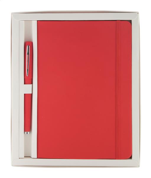Zestaw do notatek składający się z notesu ze 100 gładkimi stronami z okładką ze skóry PU i pasującym kolorystycznie plastikowym długopisem z niebieskim wkładem. Zestaw w białym pudełku prezentowym.