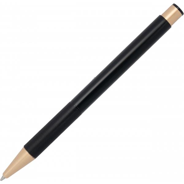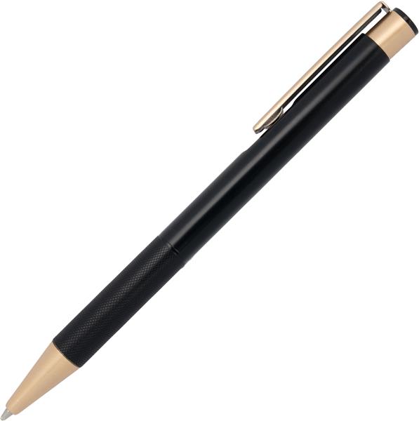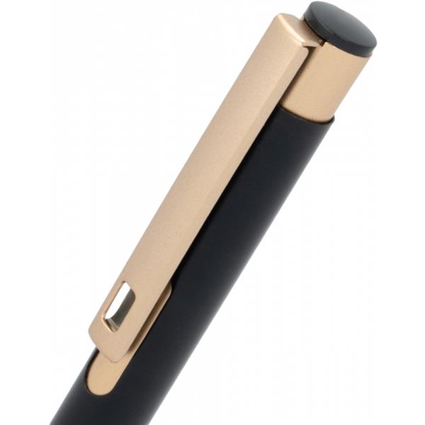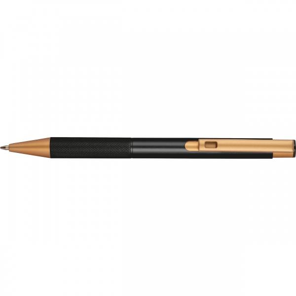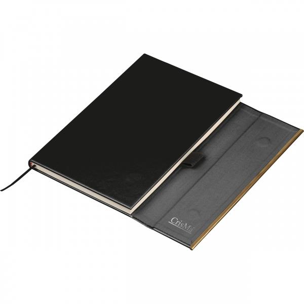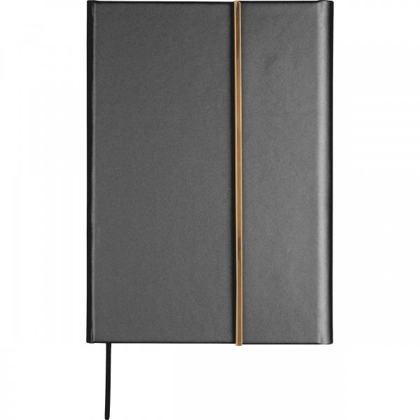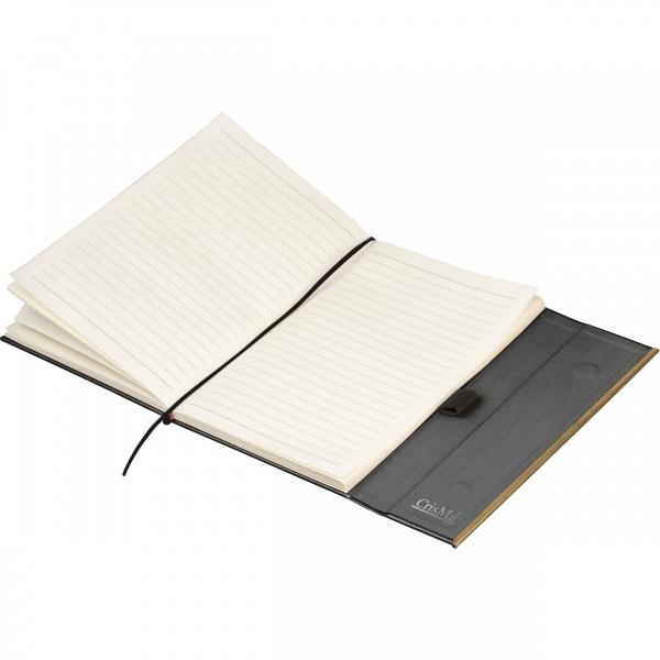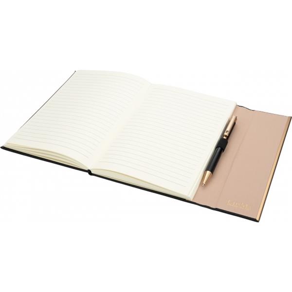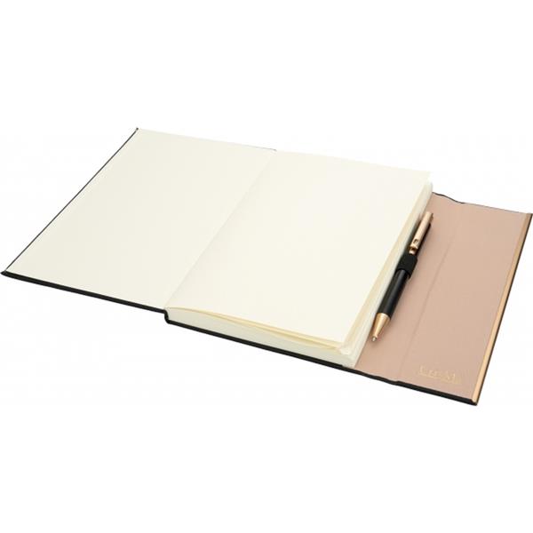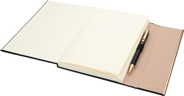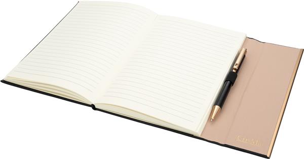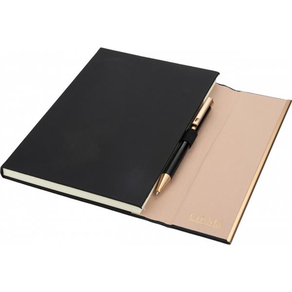 Zestaw, składający się z notesu z 96 kartkami w linie, w oprawie ze skóry pochodzącej z recyklingu i dopasowanego kolorystycznie długopisu.