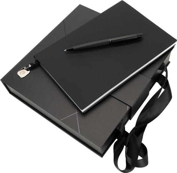Luksusowy zestaw, składający się notatnika oraz długopisu DENISE. Notatnik posiada 80 kartek w linie o gramaturze 80 g oraz materiałową zakładkę, zakończoną metalową zawieszką z logo Pierre Cardin. Z tyłu notatnika również widnieje wytłoczone logo Pierre Cardin. Długopis wyposażony jest w przekręcany mechanizm oraz niebieski wkład z końcówką 1 mm. Zestaw pakowany w pudełko prezentowe wraz z certyfikatem autentyczności. Notes 14,5 x 1,3 x 21 cm; długopis 1,1 x 13,5 cm