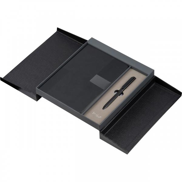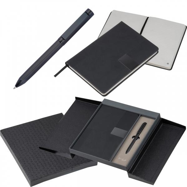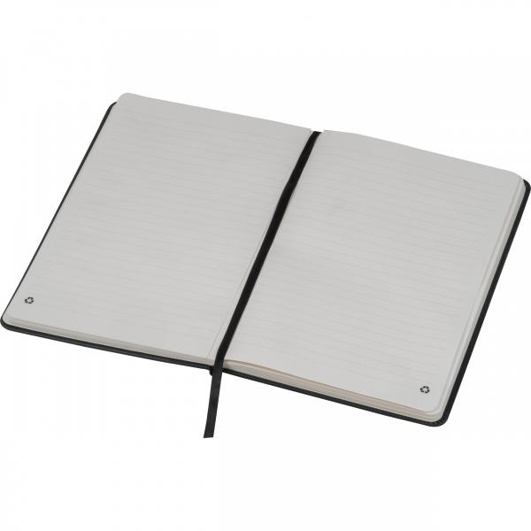 Zestaw od MoLu składający się z długopisu i notatnika ze 100 kartkami, wykonanymi z papieru z recyklingu. L3 (grawer laserowy): 3,5 x 2 cm DC2 (druk cyfrowy UV do 30 cm2): 10 x 8 cm L2 (grawer laserowy): 3 x 0,6 cm