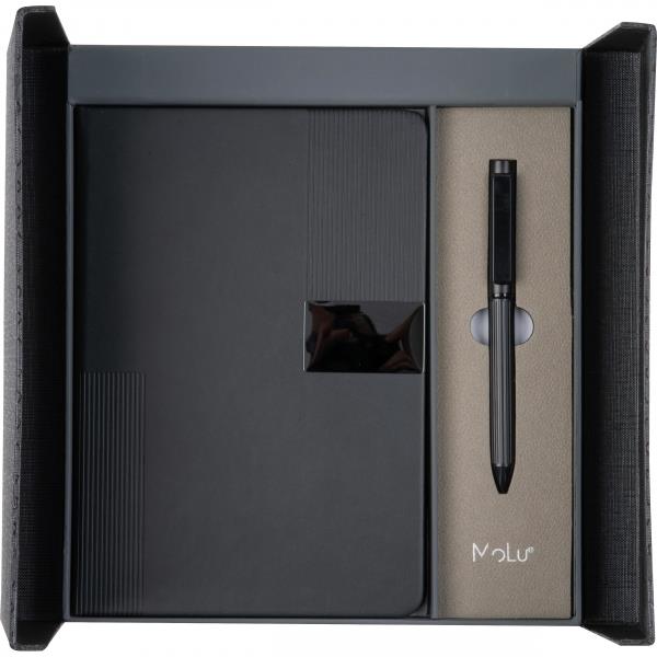 Zestaw od MoLu składający się z długopisu i notatnika ze 100 kartkami, wykonanymi z papieru z recyklingu.
