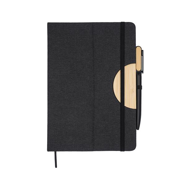 Zestaw składający się z notesu i długopisu, zdobionych bambusowymi elementami. Notes w twardej oprawie, którą można zmienić w podstawkę pod telefon. 80 kartek w linie (papier 70 g/m2), tasiemka do zaznaczania zapisanej ostatnio strony i elastyczna gumka chroniącą wnętrze. Długopis aluminiowy o matowym wykończeniu, wyposażony w niebieski wkład. Zestaw pakowany w czarne, upominkowe pudełko.