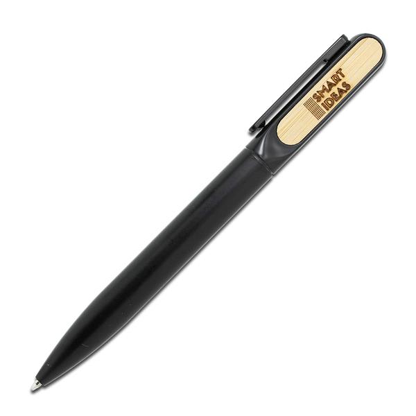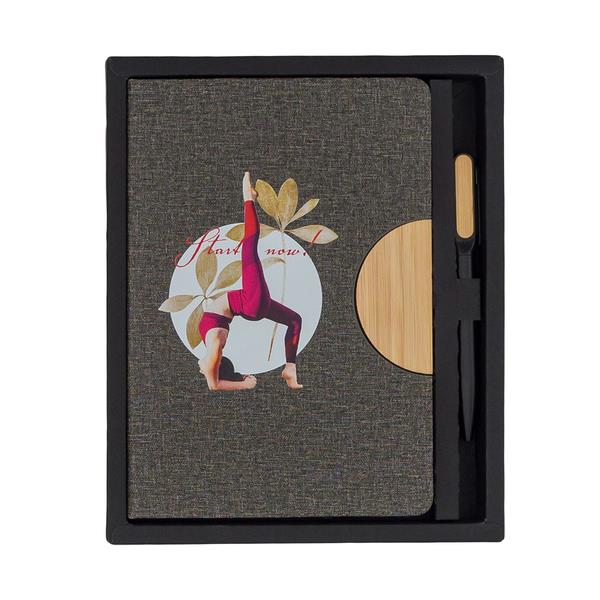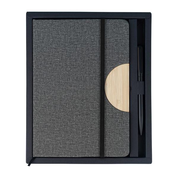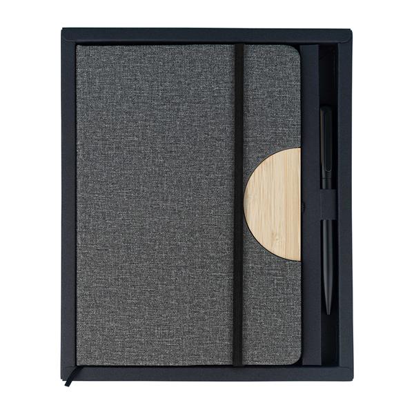 Zestaw składający się z notesu i długopisu, zdobionych bambusowymi elementami. Notes w twardej oprawie, którą można zmienić w podstawkę pod telefon. 80 kartek w linie (papier 70 g/m2), tasiemka do zaznaczania zapisanej ostatnio strony i elastyczna gumka chroniącą wnętrze. Długopis aluminiowy o matowym wykończeniu, wyposażony w niebieski wkład. Zestaw pakowany w czarne, upominkowe pudełko.