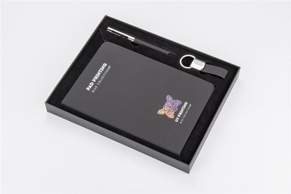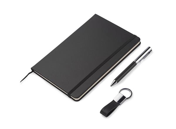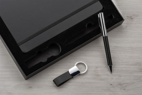 Zestaw PROBIZ składa się z notesu, długopisu i breloka. Notes posiada gładkie kartki wykonane z papieru kamiennego, format A5. Brelok wykonany jest z metalu i materiału skóropodobnego (PU). Długopis z niebieskim wkładem. Całość zapakowana w gustowne czarne pudełko. Zestaw prezentuje się niezwykle elegancko. Wymiary produktu: 145 x 210 x 13 mm (notes); 132 x ? 10 mm (długopis); 62 x 20 x 9 mm (brelok); 210 x 260 x 30 mm (pudełko)