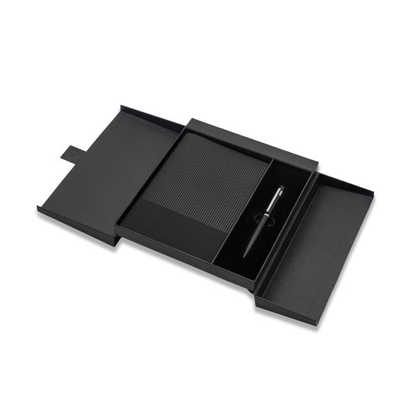 Zestaw składający się z notesu A5 (80 kartek w kratkę, 80 g/m2) i długopisu z niebieskim wkładem. Zestaw zapakowany w eleganckie pudełko.