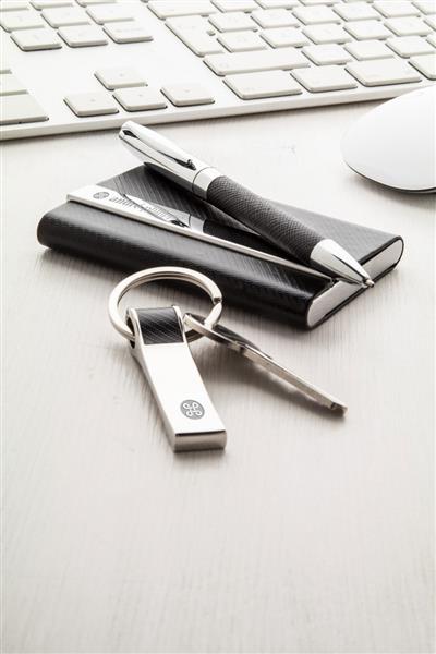 Elegancki zestaw z długopisem (czarny wkład), wizytownikiem i brelokiem do kluczy. Materiały: metal i sztuczna skóra. Produkt marki André Philippe.