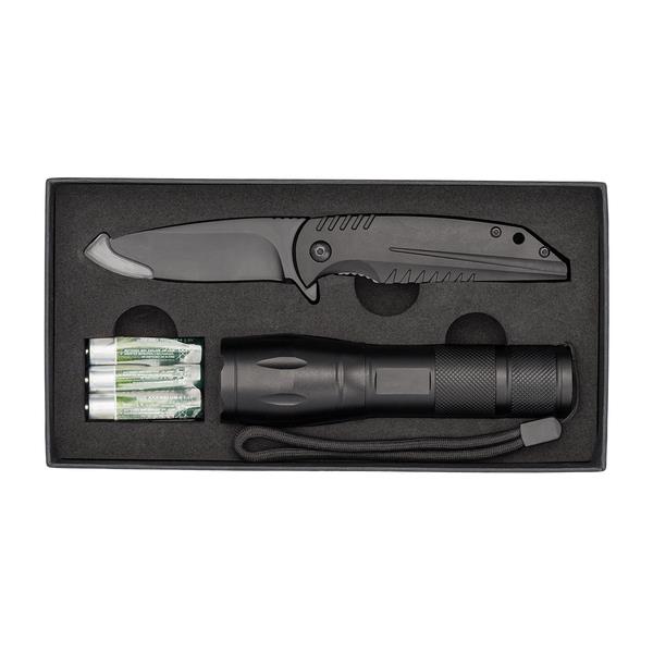 Składany nóż oraz latarka w pudełku upominkowym. Latarka wyposażona w diodę LED T6. Do zestawu dołączone są baterie – 3 AAA.