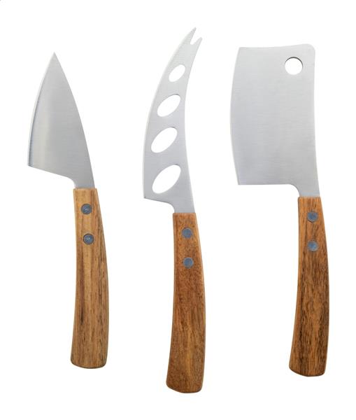 Zestaw 3 noży do sera ze stali nierdzewnej z rękojeściami z drewna akacjowego. W pudełku w kształcie książki z papieru kraft.