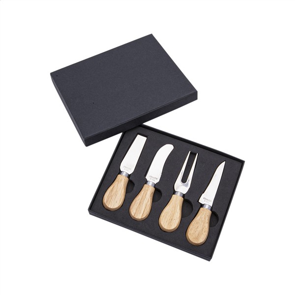 Zestaw 4 noży ze stali nierdzewnej z drewnianymi uchwytami, w czarnym pudełku.