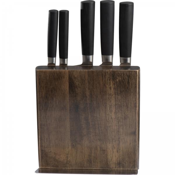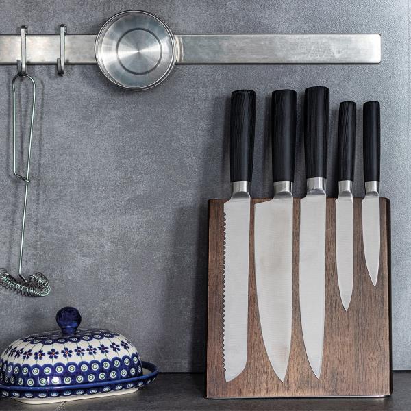 Zestaw pięciu noży kuchennych w komplecie z drewnianym stojakiem. Noże trzymają się dzięki magnesowi znajdującemu się w drewnie.