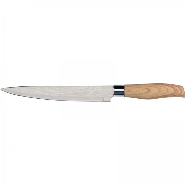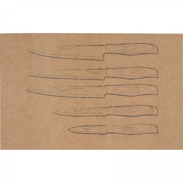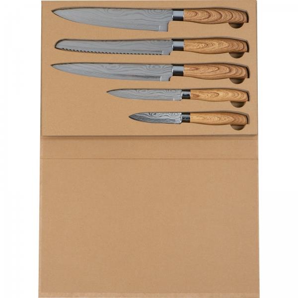 Zestaw 5 noży kuchennych w różnych rozmiarach. Noże posiadają ostrze ze stali nierdzewnej i antypoślizgową rękojeść z tworzywa imitującego drewno.
