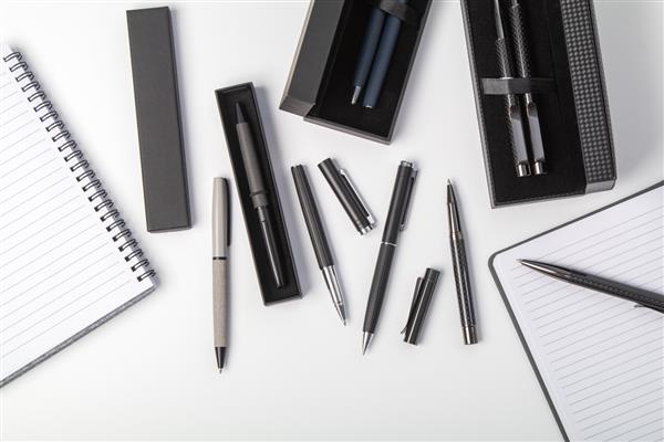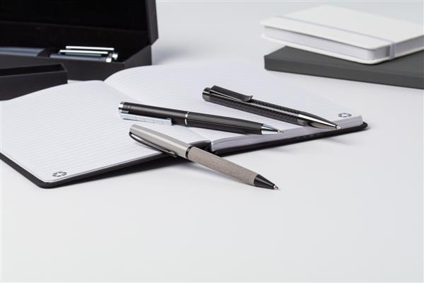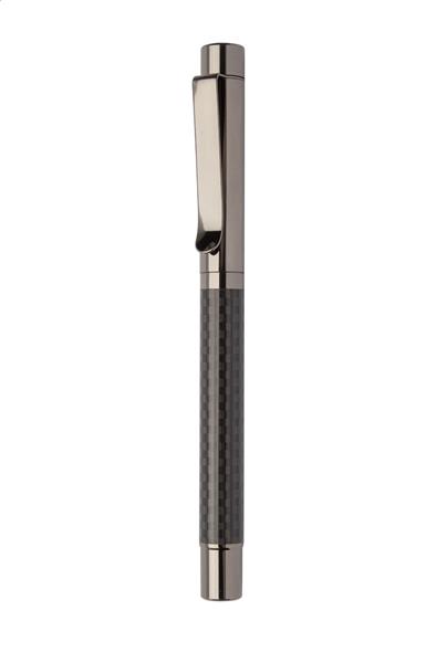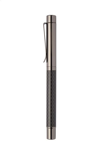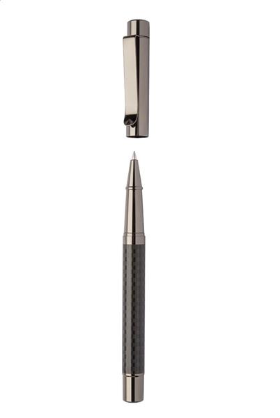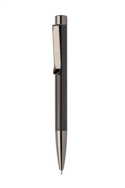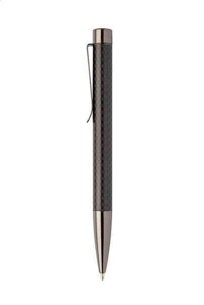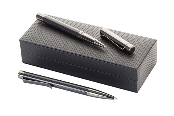 Elegancki metalowy długopis i pióro kulkowe w zestawie, z korpusami ze wzorem z karbonu i elementami z brązu. W pudełku upominkowym z karbonowym wzorem, z niebieskim wkładem.