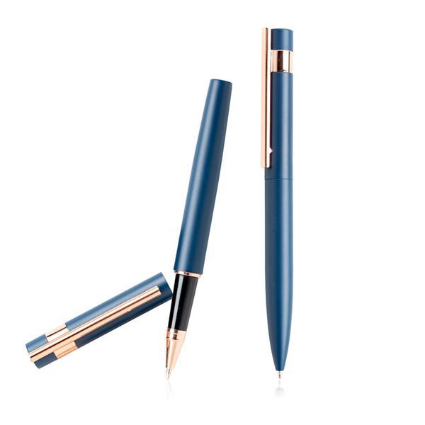 Zestaw piśmienniczy w czarnym kartoniku prezentowym wykończony elementami w kolorze rose gold, idealnie nadaje się do grawerowania. Kolor lasera wychodzi w kolorze różowozłotych detali. Rozmiar: 5,3 x 2,3 x 7,4 cm L2 (grawer laserowy): 3,5 x 0,6 Kolor: Biały