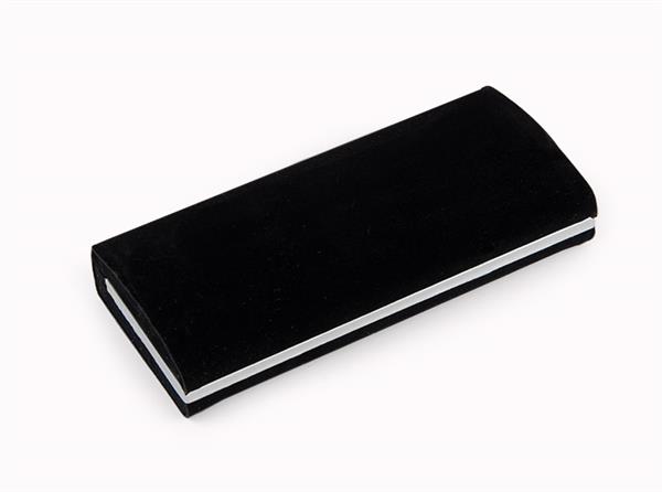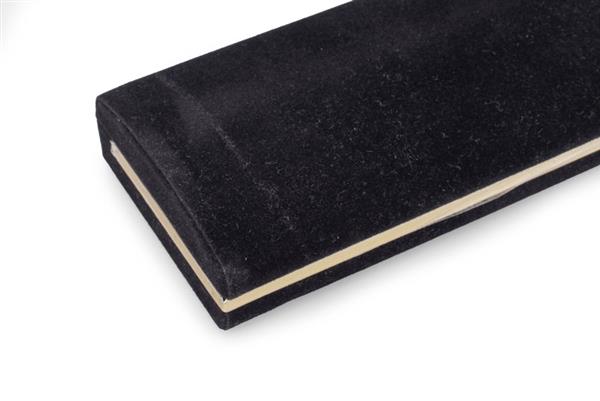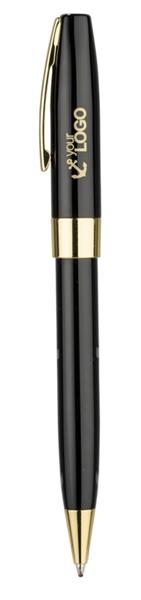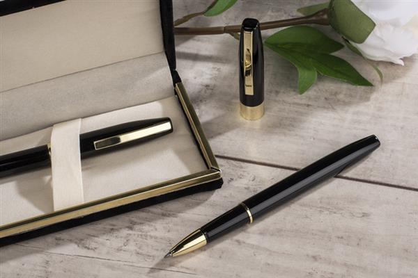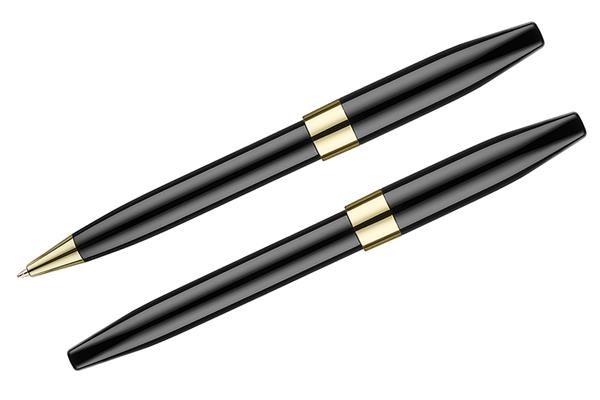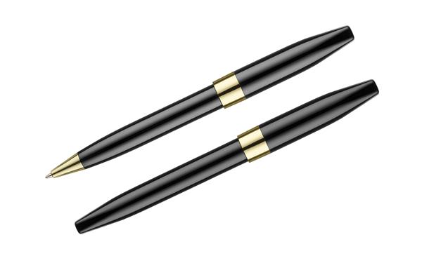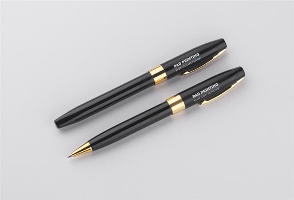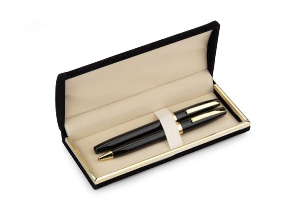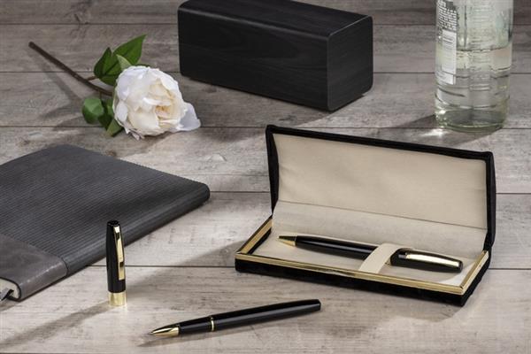 Komplet piśmienniczy ARIZONA ze złotymi wykończeniami pakowany jest w eleganckie etui wykonane z czarnego weluru. W zestawie znajduje się długopis z niebieskim wkładem oraz pióro kulkowe (rollerball) z czarnym wkładem. Logo grawerujemy w kolorze złotym na górnej części obu elementów zestawu, co nadaje im spójny i prestiżowy charakter.