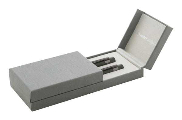 Elegancki, metalowy zestaw składający się z długopisu i pióra kulkowego z błyszczącymi, grafitowymi detalami. W pasującym kolorystycznie pudełku prezentowym, z niebieskim wkładem. Produkt marki André Philippe.