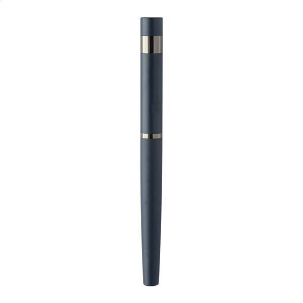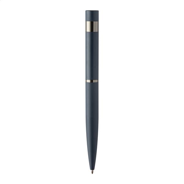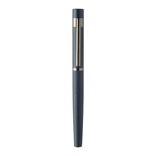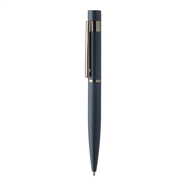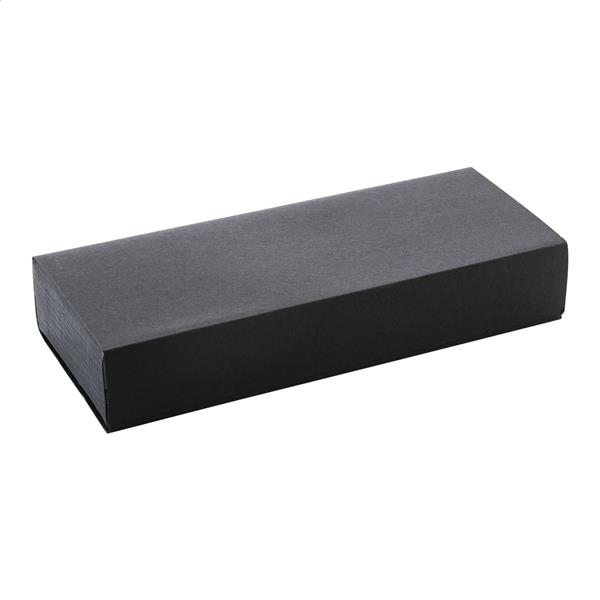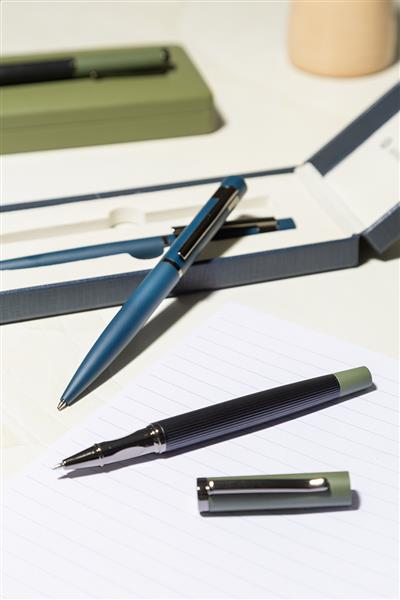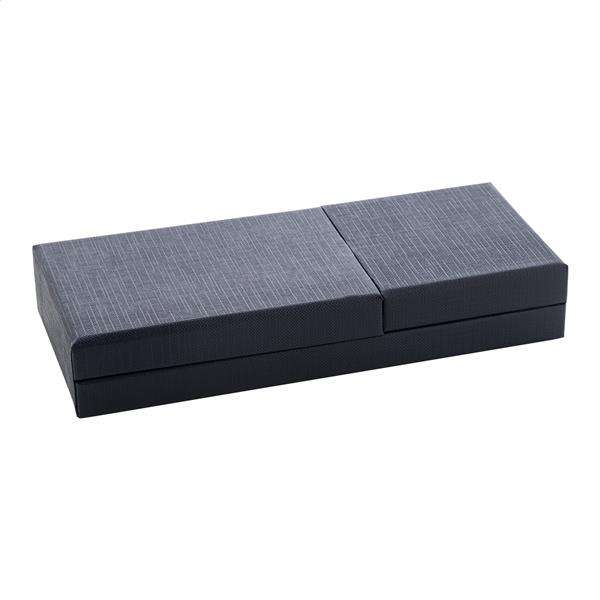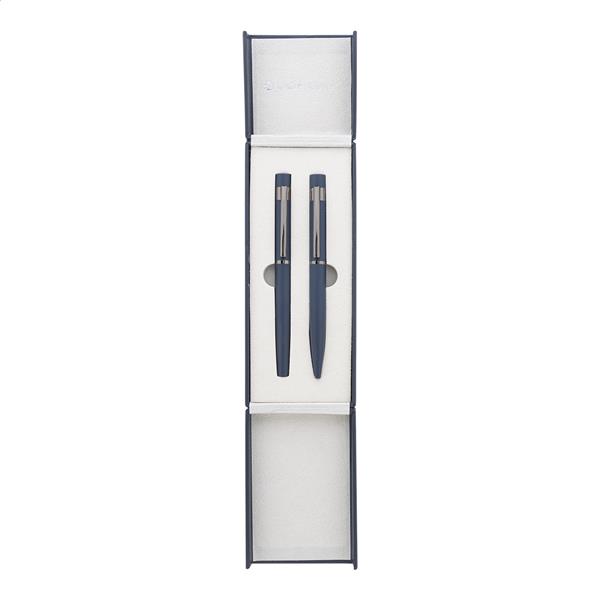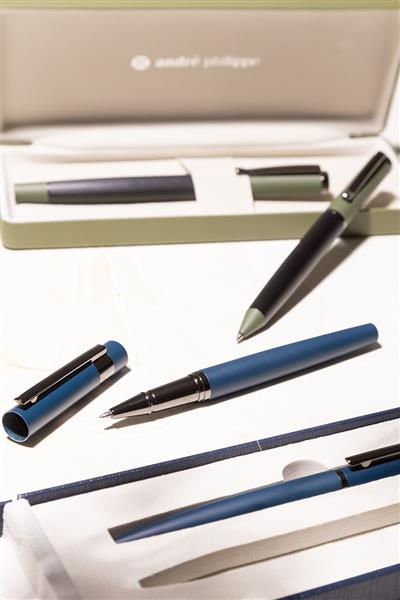 Elegancki, metalowy zestaw składający się z długopisu i pióra kulkowego z błyszczącymi, grafitowymi detalami. W pasującym kolorystycznie pudełku prezentowym, z niebieskim wkładem. Produkt marki André Philippe.