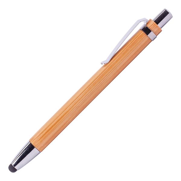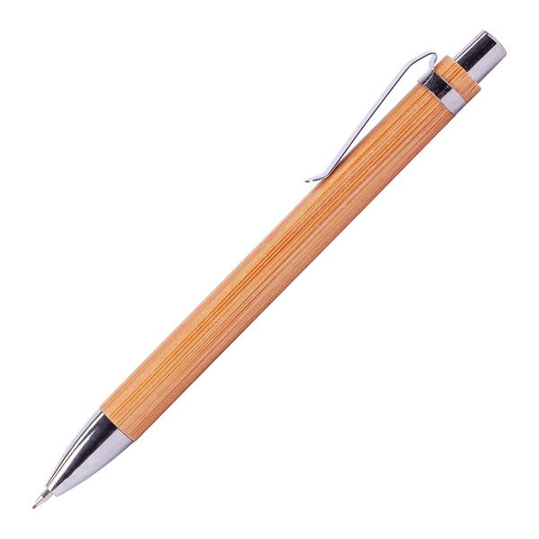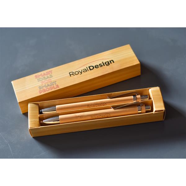 Wytworzony z dbałością o środowisko naturalne bambusowy zestaw piśmienniczy w pudełku, składający się z długopisu z końcówką do ekranów dotykowych oraz ołówka automatycznego. Bambus jest biodegradowalny, a metal nadaje się do recyklingu. Wkład długopisu w kolorze niebieskim. Pakowany w upominkowe opakowanie.