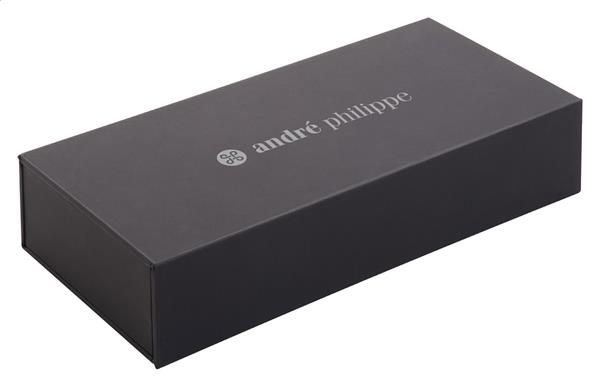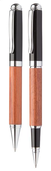Elegancki zestaw piśmienniczy, metalowy długopis i pióro kulkowe z korpusem z drzewa różanego. W pudełku prezentowym ze sztucznej skóry. Z niebieskim wkładem. Produkt marki André Philippe.