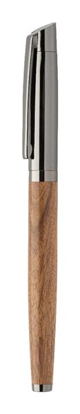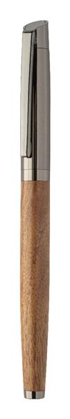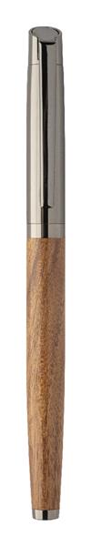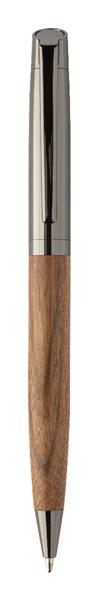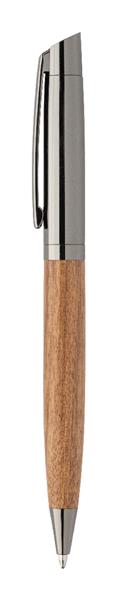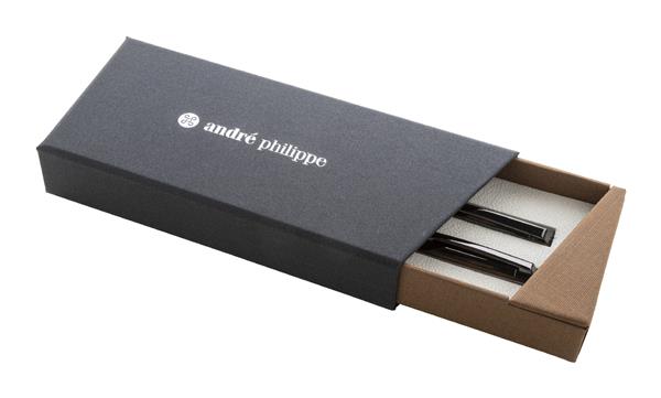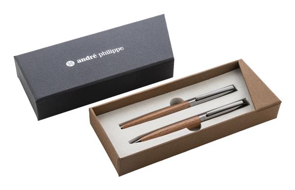 Elegancki, metalowy zestaw składający się z długopisu i pióra kulkowego z drewnianym korpusem i błyszczącymi, metalowymi detalami. W dwukolorowym pudełku prezentowym, z niebieskim wkładem. Produkt marki André Philippe.