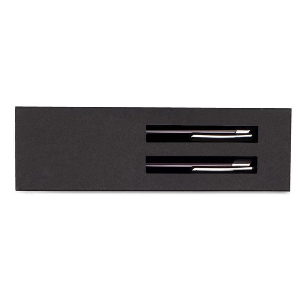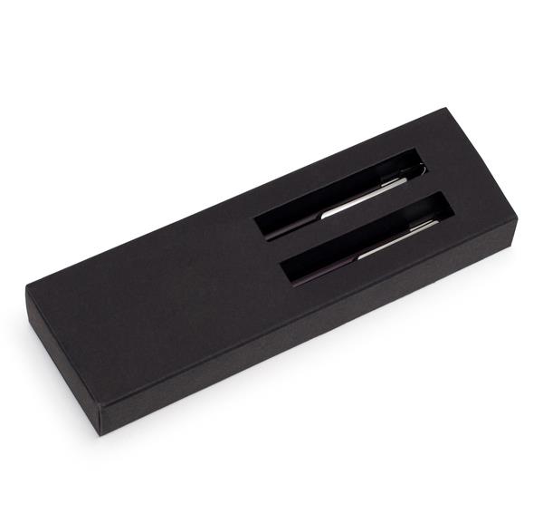 Zestaw składający się z aluminiowego długopisu i ołówka automatycznego. Wkład ołówka ma grubość 0,7 mm. Długopis z niebieskim wkładem. Zestaw pakowany jest w upominkowe etui.