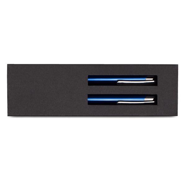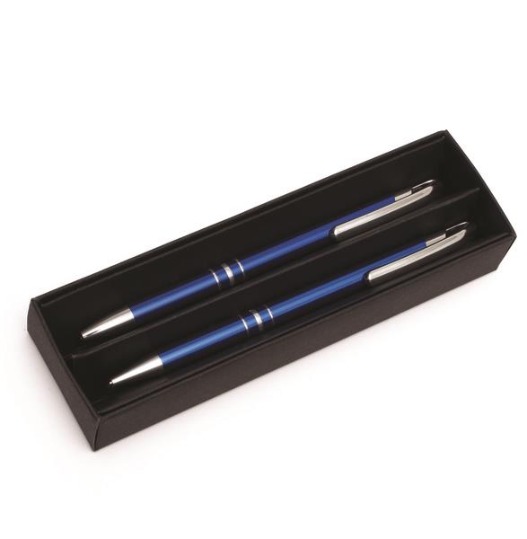 Zestaw składający się z aluminiowego długopisu i ołówka automatycznego. Wkład ołówka ma grubość 0,7 mm. Długopis z niebieskim wkładem. Zestaw pakowany jest w upominkowe etui.