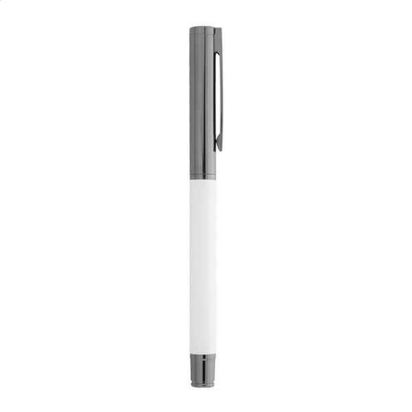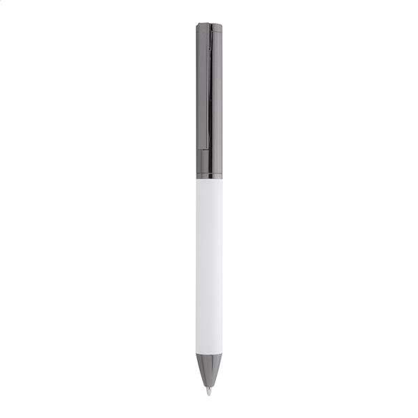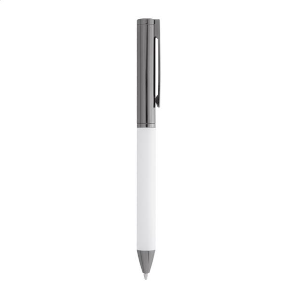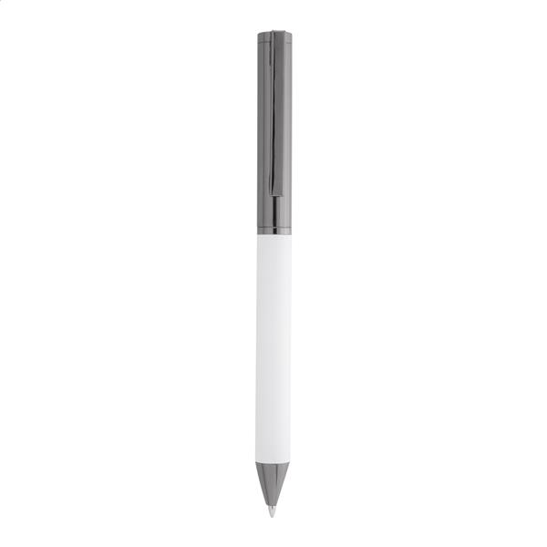Elegancki metalowy zestaw składający się z długopisu i pióra kulkowego w czarnym papierowym pudełku upominkowym. Z niebieskim wkładem.
