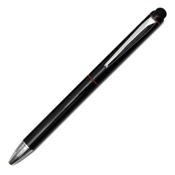 Zestaw składający się z aluminiowego długopisu i pióra kulkowego wyposażonych w końcówkę do obsługi ekranów dotykowych, pakowanych w etui z ekoskóry. Chromowane dodatki. Wkład do długopisu o średnicy 1,00 mm w kolorze niebieskim, nabój o średnicy 0,7 mm do pióra kulkowego także w kolorze niebieskim. Pakowany w czarne opakowanie upominkowe.