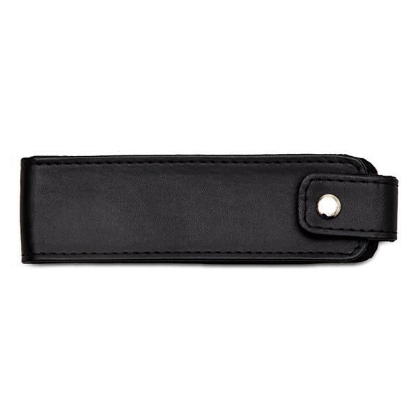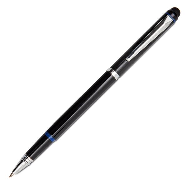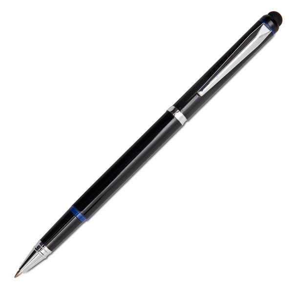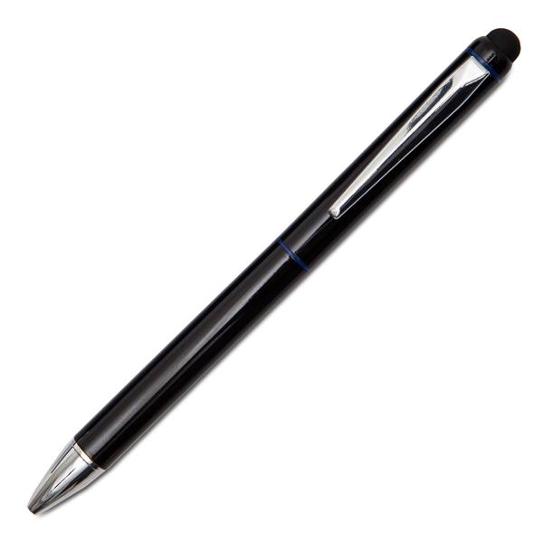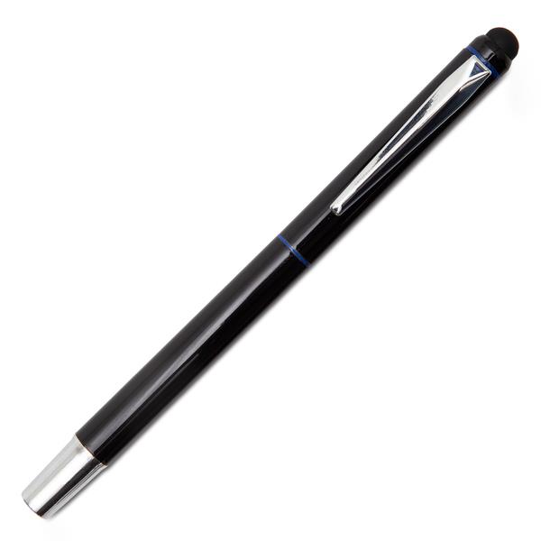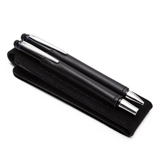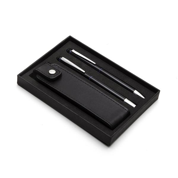 Zestaw składający się z aluminiowego długopisu i pióra kulkowego wyposażonych w końcówkę do obsługi ekranów dotykowych, pakowanych w etui z ekoskóry. Chromowane dodatki. Wkład do długopisu o średnicy 1,00 mm w kolorze niebieskim, nabój o średnicy 0,7 mm do pióra kulkowego także w kolorze niebieskim. Pakowany w czarne opakowanie upominkowe.