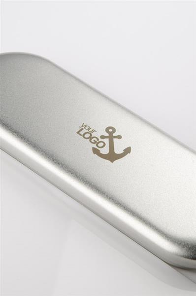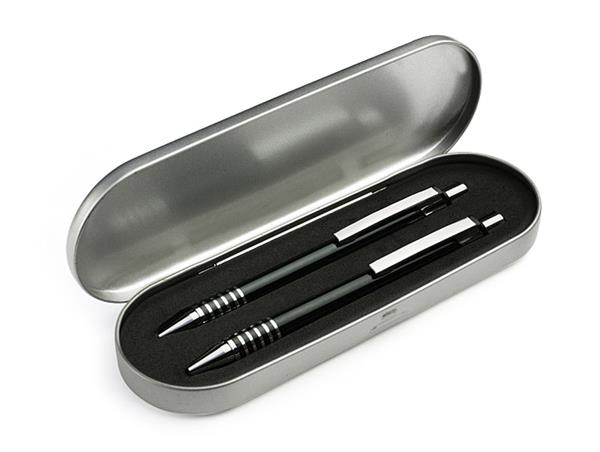 Komplet piśmienniczy DAKOTA zawiera w swoim zestawie długopis i ołówek automatyczny. Całość zapakowana w podręczne, metalowe etui. Logo grawerujemy zarówno na opakowaniu, jak i komplecie.