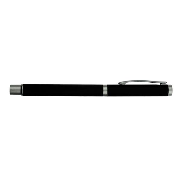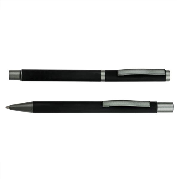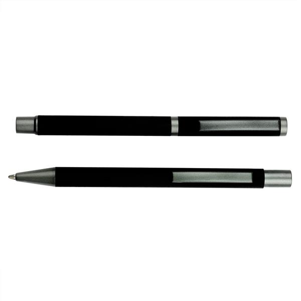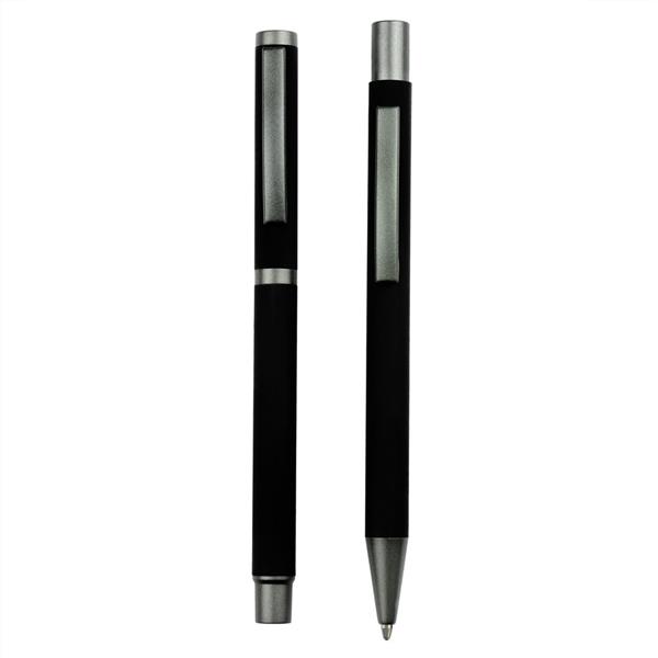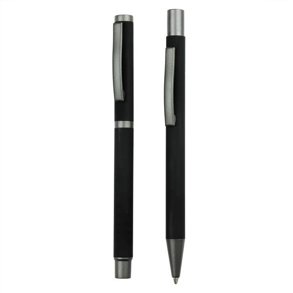 Zestaw piśmienniczy, długopis oraz pióro kulkowe z kolorowym trzonem i szarymi elementami, długopis klikany, piórko kulkowe ze skuwką, posiadają gumowe wykończenie, wkłady w niebieskim kolorze, dopasowane kolorystycznie pudełko podarunkowe w komplecie, produkt wykonany z aluminium i plastiku
