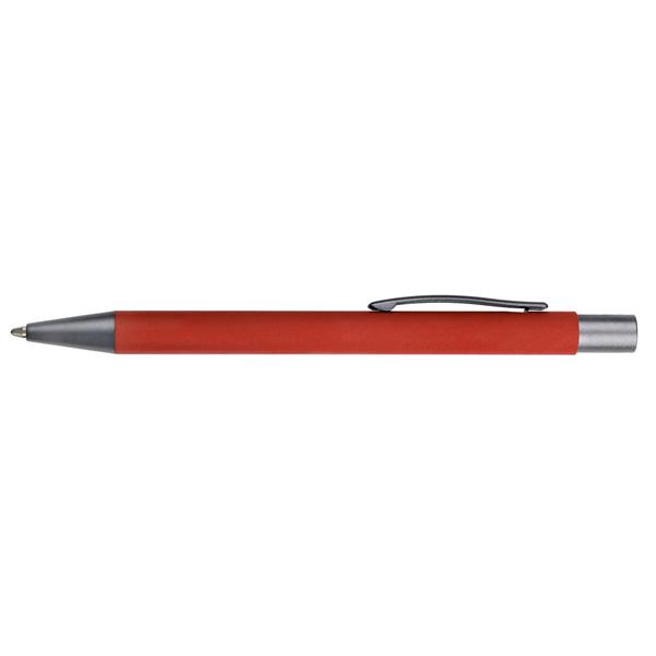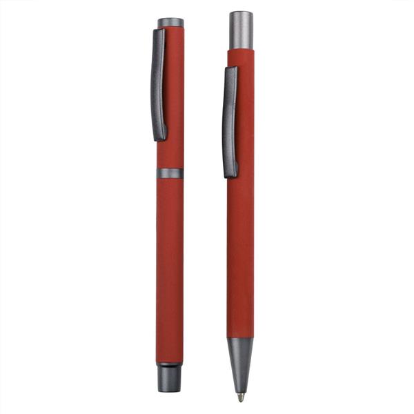 Zestaw piśmienniczy, długopis oraz pióro kulkowe z kolorowym trzonem i szarymi elementami, długopis klikany, piórko kulkowe ze skuwką, posiadają gumowe wykończenie, wkłady w niebieskim kolorze, dopasowane kolorystycznie pudełko podarunkowe w komplecie, produkt wykonany z aluminium i plastiku