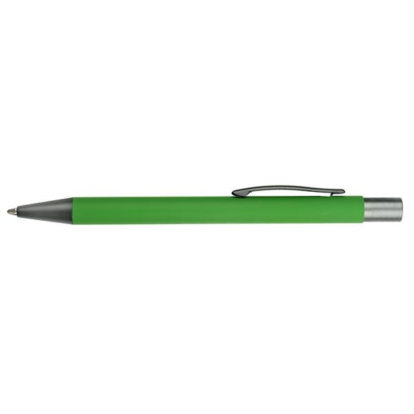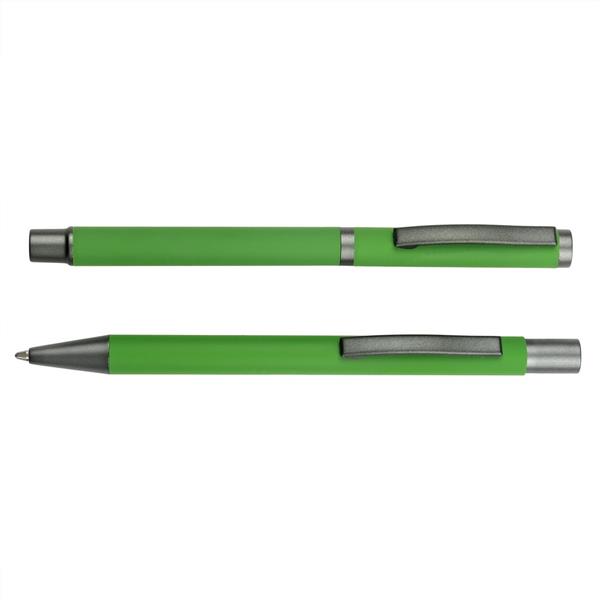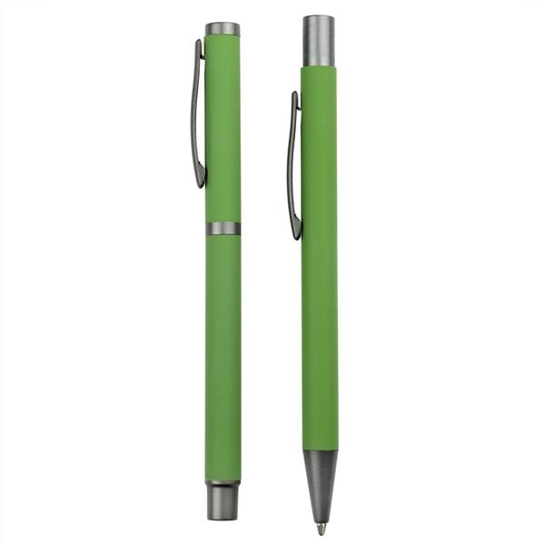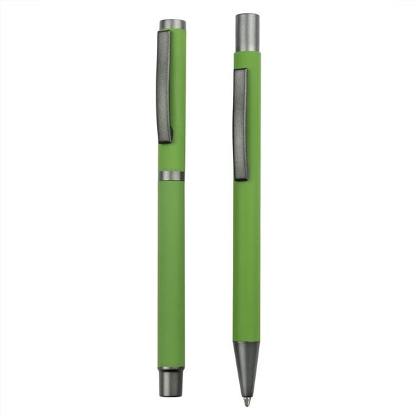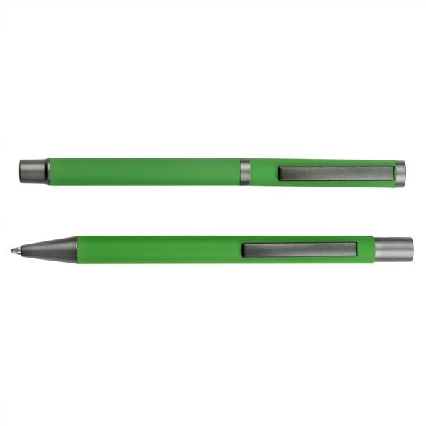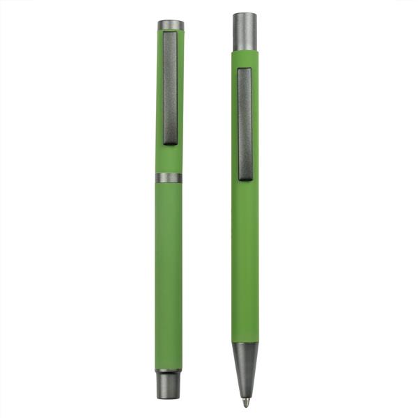 Zestaw piśmienniczy, długopis oraz pióro kulkowe z kolorowym trzonem i szarymi elementami, długopis klikany, piórko kulkowe ze skuwką, posiadają gumowe wykończenie, wkłady w niebieskim kolorze, dopasowane kolorystycznie pudełko podarunkowe w komplecie, produkt wykonany z aluminium i plastiku