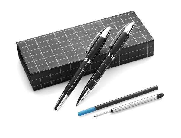 Zestaw piśmienniczy, długopis i pióro kulkowe, dodatkowe niebieskie wkłady, w ozdobnym pudełku z magnetycznym zamknięciem