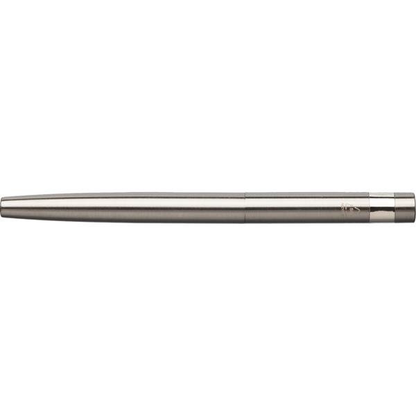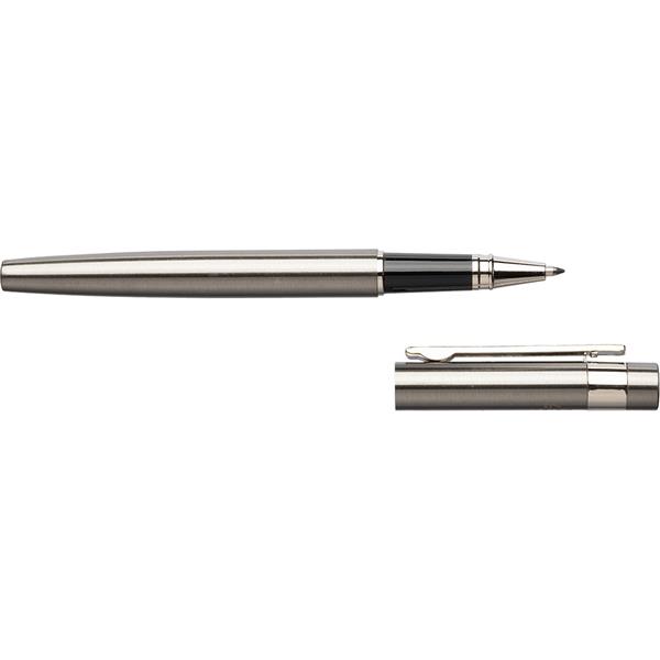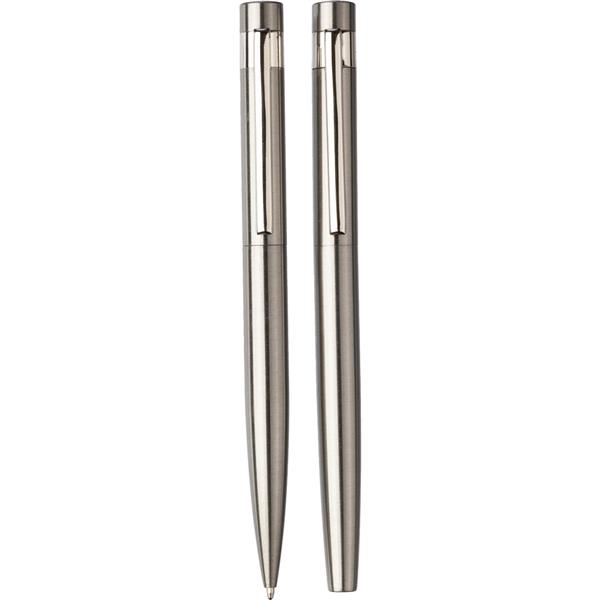 Zestaw piśmienniczy, w skład którego wchodzi długopis przekręcany i pióro kulkowe, posiadają wkład w niebieskim kolorze, zapakowane razem w pudełko z papieru kraftowego, ikona stali nierdzewnej z recyklingu na produktach, produkty wykonane ze stali nierdzewnej z recyklingu