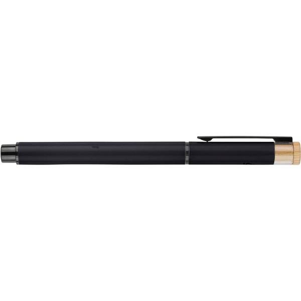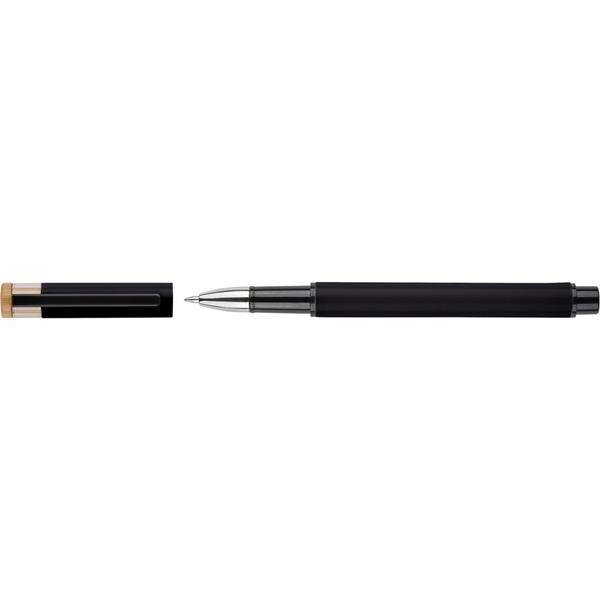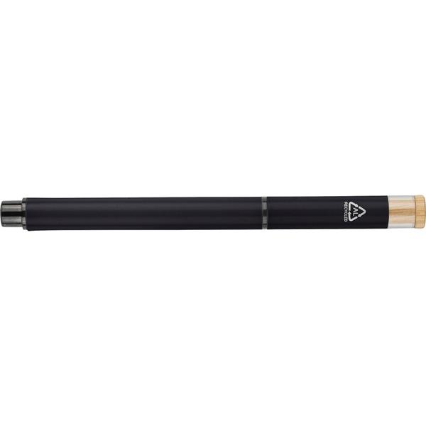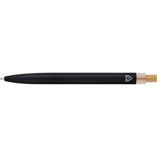 Zestaw piśmienniczy, w którego w skład wchodzi: długopis z bambusowym przyciskiem, ikoną recyklingu na produkcie, metalowym klipsem, tusz w niebieskim kolorze, wystarczający na ok. 700 m pisania, pióro kulkowe z pokrywką, metalowym klipsem, ikoną recyklingu na produkcie, wkład w niebieskim kolorze, wystarczający na ok. 500 m pisania, zapakowany w kolorowe pudełko upominkowe z recyklingu, produkt wykonany z aluminium z recyklingu, RPET i metalu