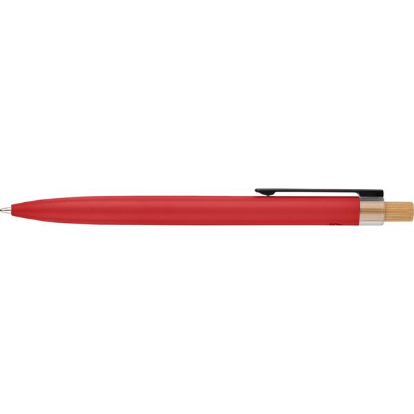 Zestaw piśmienniczy, w którego w skład wchodzi: długopis z bambusowym przyciskiem, ikoną recyklingu na produkcie, metalowym klipsem, tusz w niebieskim kolorze, wystarczający na ok. 700 m pisania, pióro kulkowe z pokrywką, metalowym klipsem, ikoną recyklingu na produkcie, wkład w niebieskim kolorze, wystarczający na ok. 500 m pisania, zapakowany w kolorowe pudełko upominkowe z recyklingu, produkt wykonany z aluminium z recyklingu, RPET i metalu