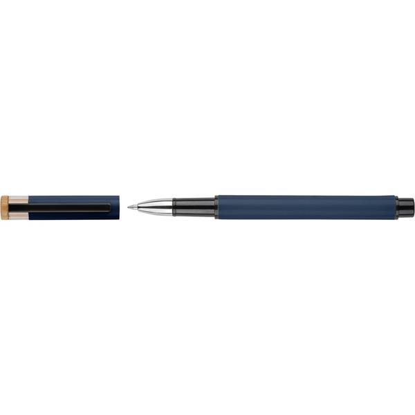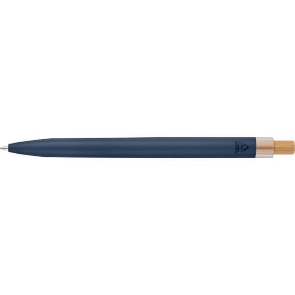 Zestaw piśmienniczy, w którego w skład wchodzi: długopis z bambusowym przyciskiem, ikoną recyklingu na produkcie, metalowym klipsem, tusz w niebieskim kolorze, wystarczający na ok. 700 m pisania, pióro kulkowe z pokrywką, metalowym klipsem, ikoną recyklingu na produkcie, wkład w niebieskim kolorze, wystarczający na ok. 500 m pisania, zapakowany w kolorowe pudełko upominkowe z recyklingu, produkt wykonany z aluminium z recyklingu, RPET i metalu