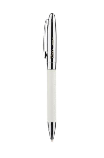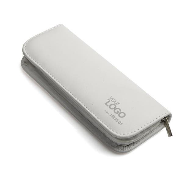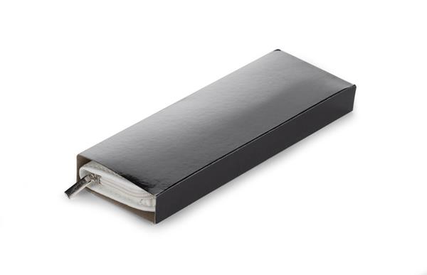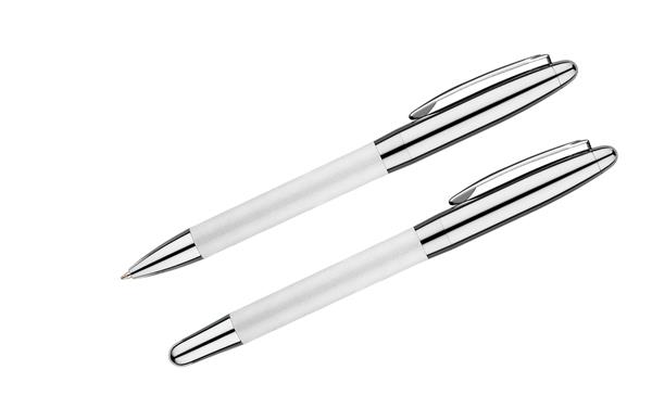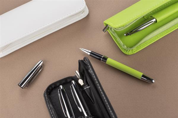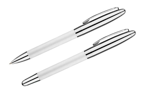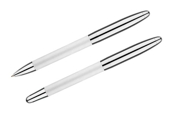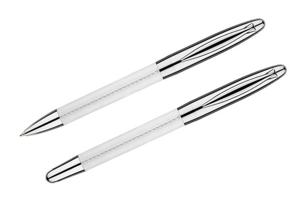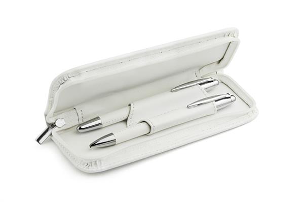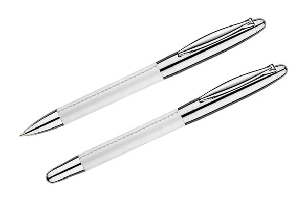 Komplet piśmienniczy: długopis i pióro kulkowe w etui z materiału skóropodobnego (PU). Długopis i pióro kulkowe z wkładami w kolorze niebieskim. Logo wygrawerujemy na artykułach piśmienniczych.