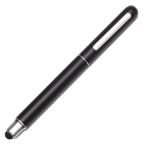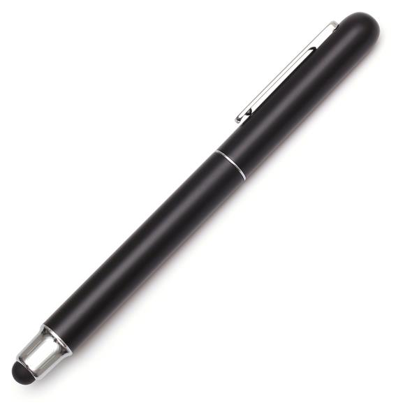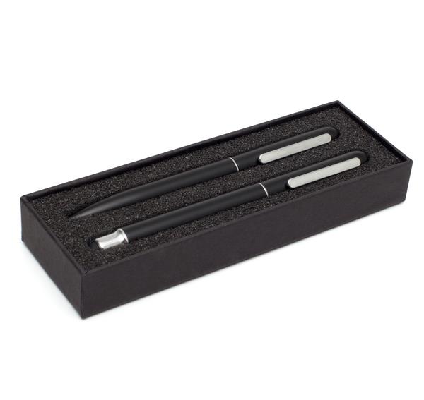 Zestaw składający się z aluminiowego długopisu i pióra kulkowego. Pióro kulkowe wyposażone jest w gumowy rysik do obsługiwania urządzeń mobilnych. Chromowane wykończenia. Długopis z 1.00 mm wkładem w kolorze niebieskim, pióro kulkowe z wkładem o grubości 0,7 mm. Zestaw pakowany jest w czarne, upominkowe etui kartonowe.