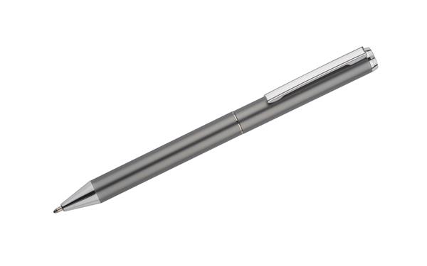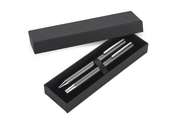 Zestaw ILLINOIS to zestaw prezentujący się niezwykle estetycznie, w którego skład wchodzi długopis i pióro kulkowe. Wykonany został z recyklingowanego aluminium. Kolor wkładu niebieski. Wymiary produktu: 140 x ? 10 mm (długopis); 143 x ? 10 mm (pióro kulkowe); 180 x 55 x 24 mm (pudełko)