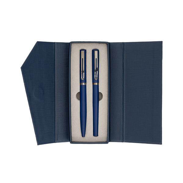 Zestaw piśmienniczy składający się z metalowego pióra kulkowego i długopisu. Wkład w kolorze niebieskim. Zapakowany w upominkowe opakowanie.