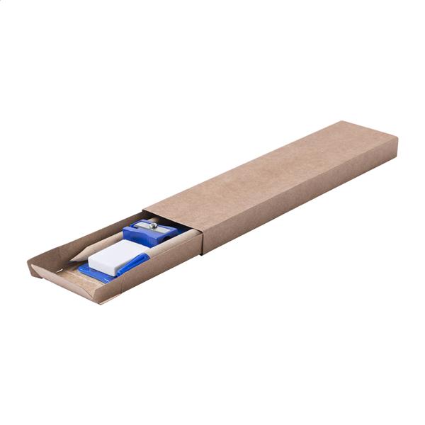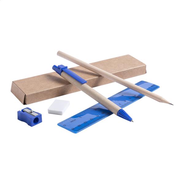 5-elementowy zetaw w kartonowym pudełku. Zawiera: długopis z papieru z recyklingu z niebieskim wkładem, ołówek, linijkę, gumkę i temperówkę.