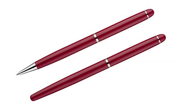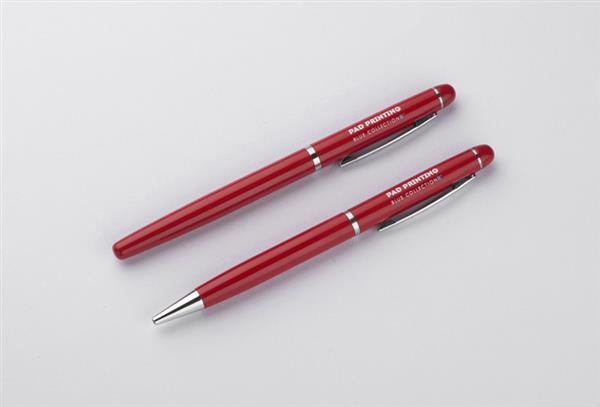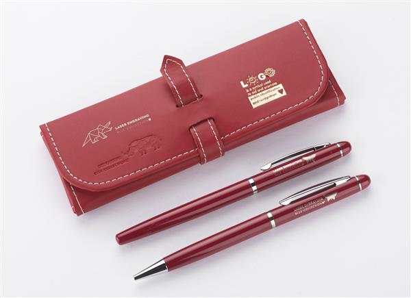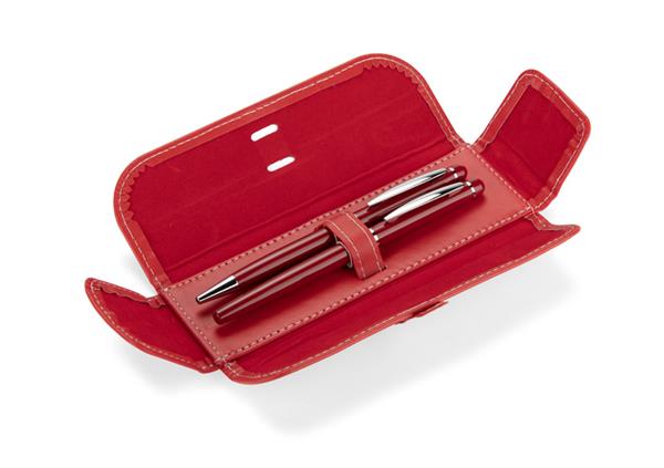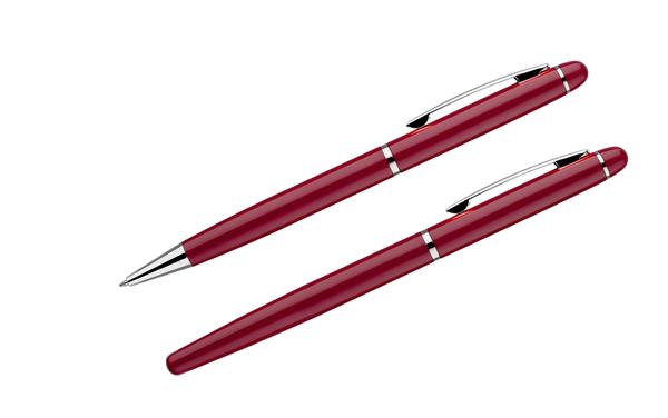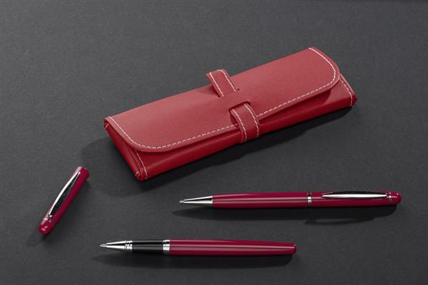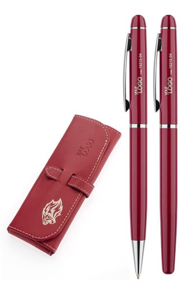 Elegancki zestaw piśmienniczy pakowany w etui z materiału skóropodobnego (PU). W zestawie znajdują się długopis oraz pióro kulkowe. Logo wygrawerujemy na powierzchni artykułów piśmienniczych.