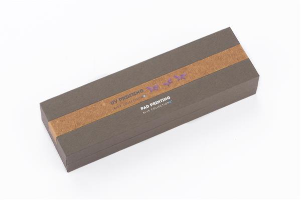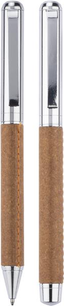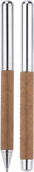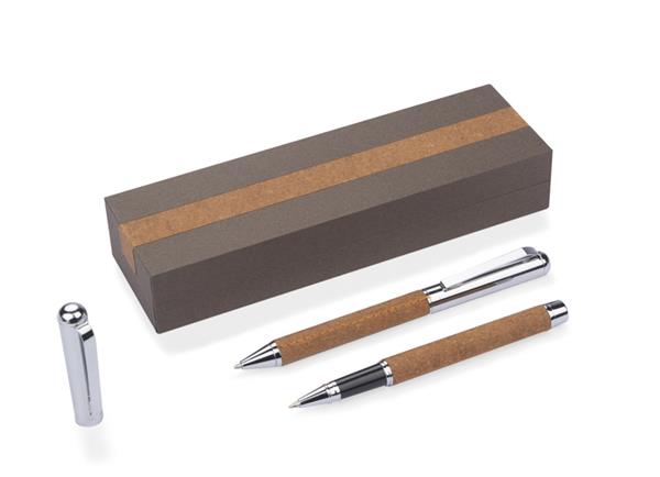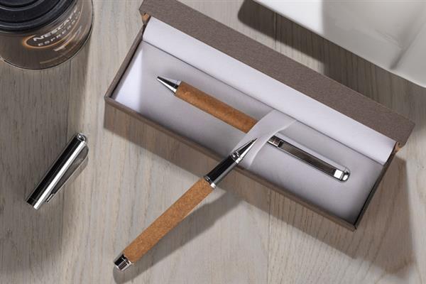 Zestaw OHIO to propozycja eleganckiego kompletu piśmienniczego nawiązującego do eko trendów. Metalowy korpus długopisów został wykończony naturalną skórą z recyklingu. Chromowane wykończenia świetnie komponują się z naturalnym surowcem na korpusie. W zestawie długopis oraz pióro kulkowe. Wkłady w kolorze niebieskim. Zestaw zapakowany w gustowne pudełko wykonane z papieru. Wieczko ozdobione skórą z recyklingu.