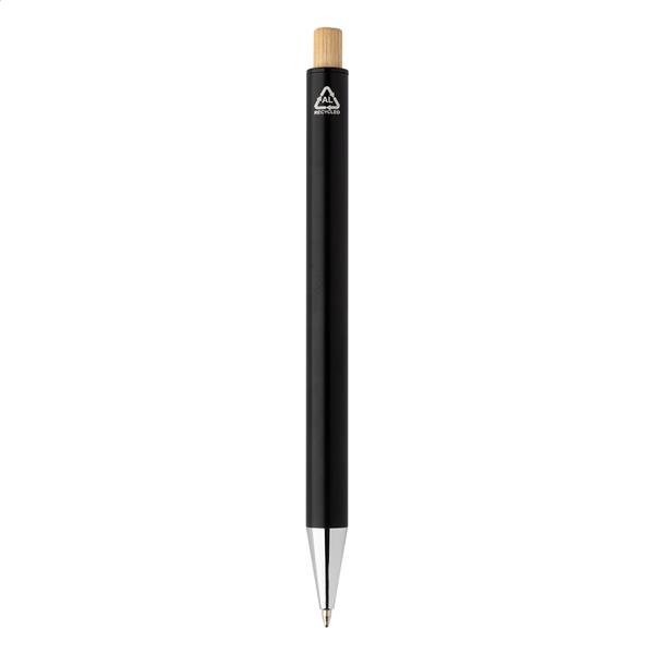 Zestaw z aluminium pochodzącego z recyklingu, składający się z długopisu i ołówka automatycznego z bambusowymi przyciskami. Z niebieskim wkładem i rysikiem 0,7 mm. W pudełku z papieru kraft.