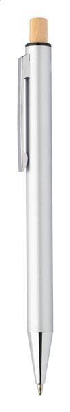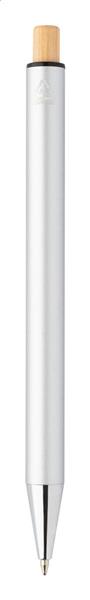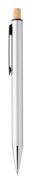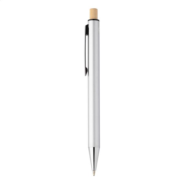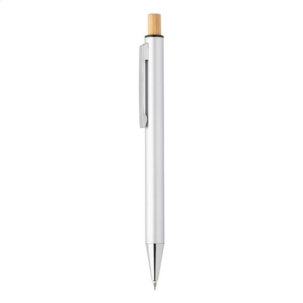 Zestaw z aluminium pochodzącego z recyklingu, składający się z długopisu i ołówka automatycznego z bambusowymi przyciskami. Z niebieskim wkładem i rysikiem 0,7 mm. W pudełku z papieru kraft.