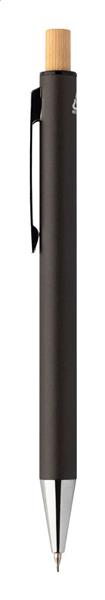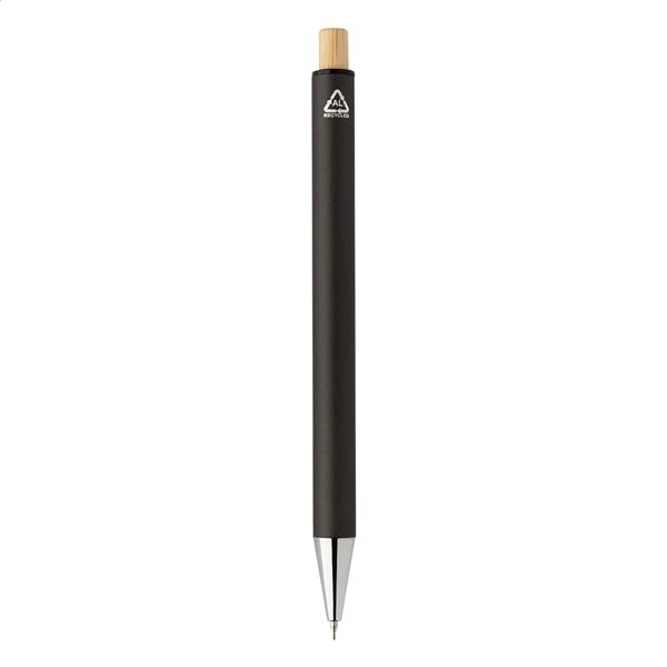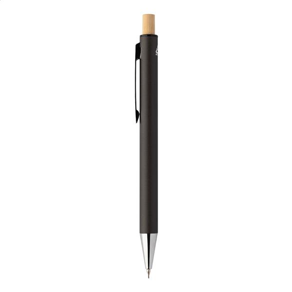 Zestaw z aluminium pochodzącego z recyklingu, składający się z długopisu i ołówka automatycznego z bambusowymi przyciskami. Z niebieskim wkładem i rysikiem 0,7 mm. W pudełku z papieru kraft.