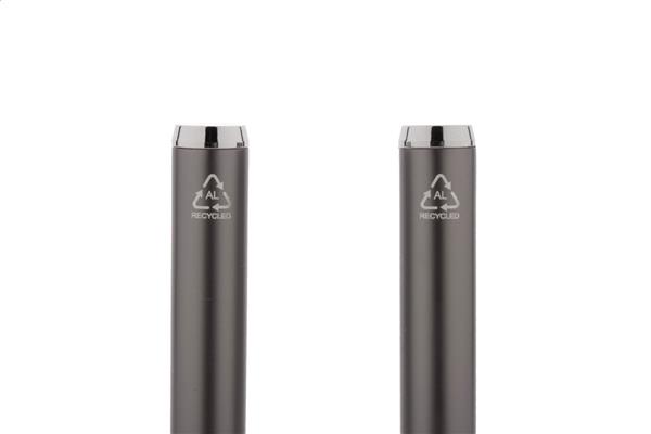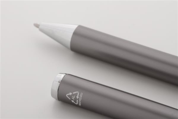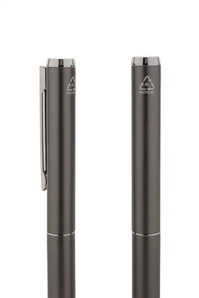 Zestaw piśmienniczy z aluminium pochodzącego z recyklingu, składający się pióra kulkowego i długopisu w pudełku upominkowym z czarnego papieru. Z niebieskim wkładem.
