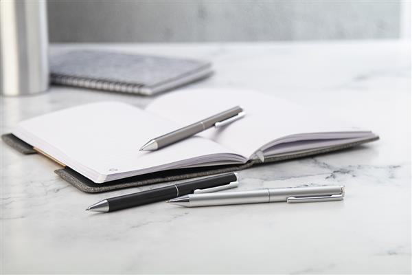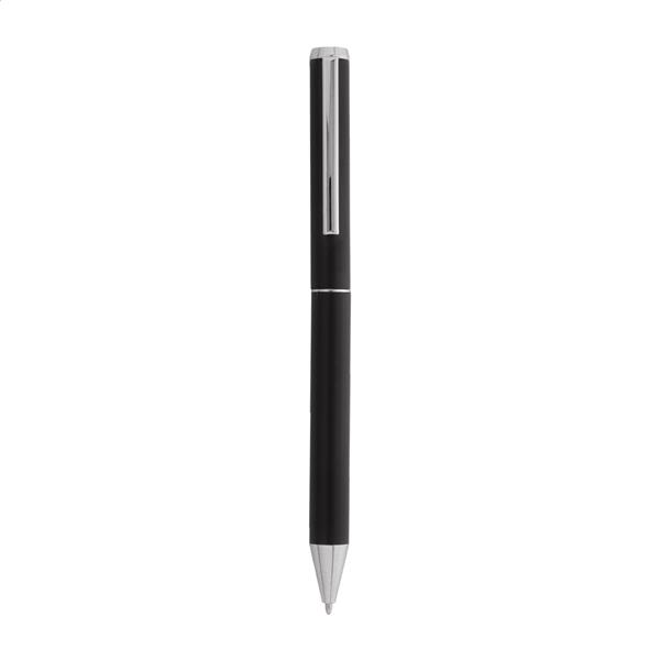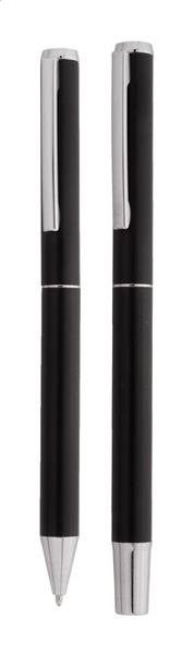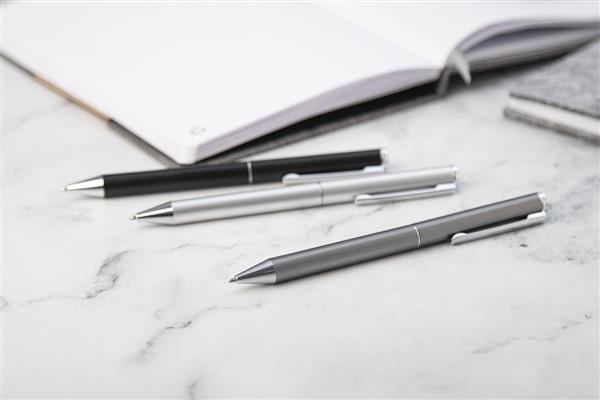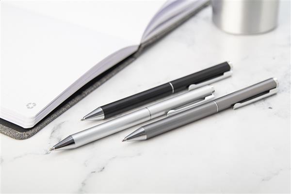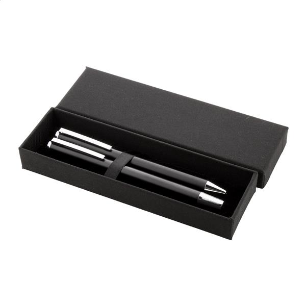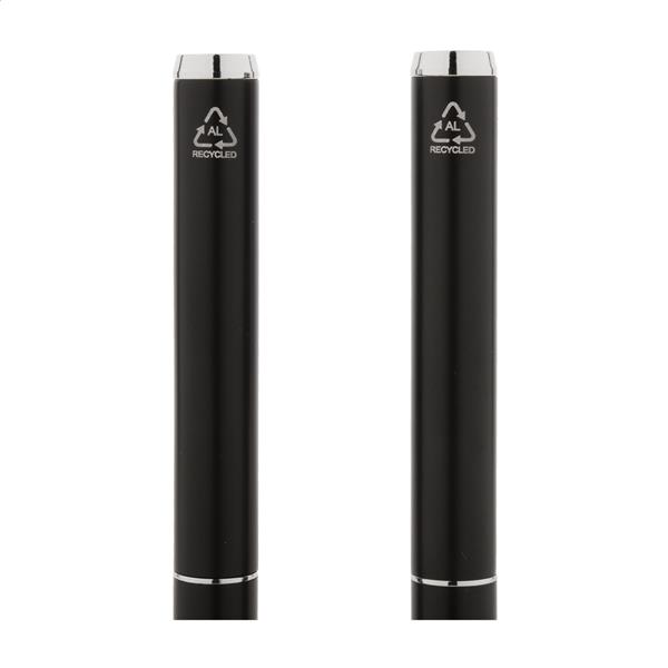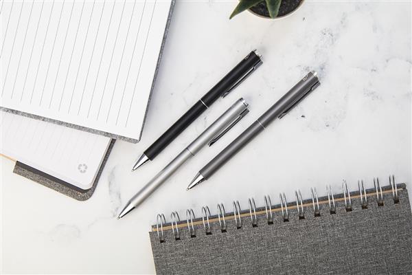 Zestaw piśmienniczy z aluminium pochodzącego z recyklingu, składający się pióra kulkowego i długopisu w pudełku upominkowym z czarnego papieru. Z niebieskim wkładem.